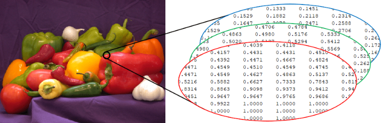 Aşağıdaki görselde, üç farklı şekilde temsil edilen gri tonlu bir dijital görüntüyü ele alalım. Soldaki ilk resmin piksellerini rahatça seçebilir ve aralarındaki yoğunluk farkını görebilirsiniz. Peki bu yoğunlukların sayısal değeri nedir? İşte o da ortadaki görselde verilmiş olan renk kodlarıdır. Aşağıdaki görselde ise bu değerlerin matematiksel bağlamda algoritmalarla yazılmış halini görüyorsunuz: iki boyutlu bir matris. Evet, aslında her dijital görüntü iki boyutlu bir matris olarak gösterilebilir. Peki, bu örneklerdeki dijital görüntüyü renksiz/gri tonlu olduğu için bu şekilde gösterdik. Eğer renkli olsaydı nasıl gösterilebilirdik? Bu kez de üç farklı matris kullanmak zorunda kalacaktık, zira kırmızı yeşil ve mavi ana renklerinin her biri için bir matrise ihtiyacımız olacaktır. Bu ana renklerin arasında kalan renkler ise, ana renklerin yoğunluklarının kombinasyonları ile gösterilebilecekti. Aşağıda bir örneğini inceleyelim.