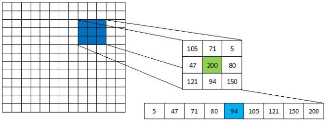 Bu parazitler, görüntünün elde edilmesi sırasında sensörün yetersizliğinden veya dijital görüntünün aktarılması sürecinde çıkan sorunlardan kaynaklanıyor olabilir. Görüntü işleme dünyasında bu tür parazitlere ‘salt and pepper noise’ adı veriliyor. Türkçesi ‘tuz ve biber’ paraziti anlamına gelir. Adı her ne kadar günlük yaşamdan alıntı olsa da gerçekten de kullanılan teknik terim tam olarak bu. Bu gibi sorunların kaynağını çözmek her zaman mümkün olmayabilir. Görüntü sensörünü (yani görüntüyü elde eden kamera veya fotoğraf makinesi) değiştiremeyebilirsiniz veya aktarım altyapısı (örneğin kablolar) sabit kalmak zorunda olabilir. Bu parazitleri ortadan kaldırmak için, elinizdeki dijital görüntüyü matris formatında tekrar işlemeniz gerekmektedir. Görüntü matrisine uygulayacağınız çeşitli modellemeler ve fonksiyonlar sayesinde bu parazitleri fark edilmeyecek duruma getirebilir, hatta yok edebilirsiniz. Makalede fazla teknik detaya girmeden, basit bir fonksiyonu ele alalım. Medyan (ortanca) filtreleme olarak bilinen bir fonksiyon, yukarıda gösterdiğimiz tuz ve biber parazitini azaltmada yaygın olarak kullanılır. Filtreleme algoritması, küçük bir matris kullanarak tüm görüntüyü tarar, piksel kümesini sıralar, matris içindeki ortanca piksel değerlerini alır. Bu ortanca değeri daha sonra parazitli görüntüde işlenen kısma yazar. Aşağıda bunun bir çizimi bulunmaktadır. Soldaki 12x12’lik matris, bizim parazitli görüntümüz olsun. Bu görüntünün üzerinden 3x3’lik matrisle geçerek, değerleri sıralayıp, ortanca değeri merkeze yerleştirdiğimizde, ortanca filtresini uygulamış oluruz.