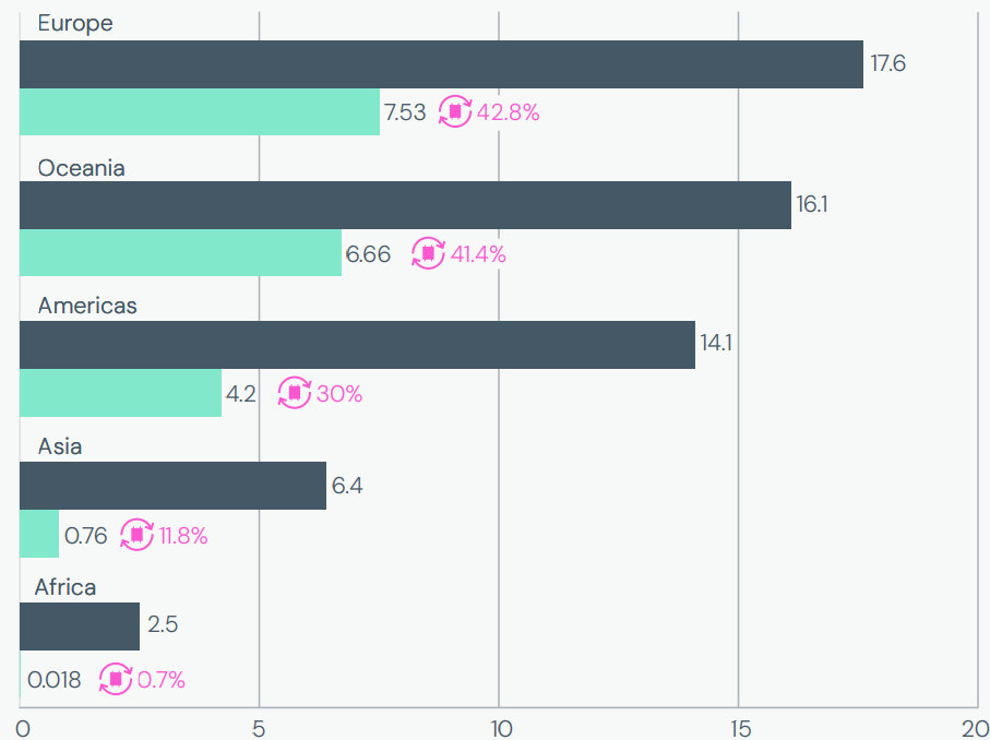 Ancak 2024 yılında üretilen e-atığın %10’undan az bir miktarının belgelenip geri dönüştürüldüğünü ifade edilmektedir. Aşağıdaki tablo, Avrupa Okyanusya, Amerika, Asya ve Afrika olmak üzere dünya kıtaları üzerindeki e-atık üretimini ve geri dönüşüm oranlarını gösteriyor. Tabloda koyu yeşil, üretilen e-atığı; açık yeşil, geri dönüştürülebilir olarak belgelenen e-atığı temsil ediyor. Pembe renkteki yüzdeler ise geri dönüşüm oranını göstermektedir. Bu verilerin ışığında meselenin ciddiyeti daha da iyi anlaşıyor. Sonuç kaçınılmaz: etkin bir e-atık yönetimi ihtiyacı mevcut. Bu konuda Türkiye'nin önünde uzun bir yol var gibi görünüyor. Ancak neyse ki, Almanya gibi e-atık geri dönüşümünde birikim sahibi olmuş ülkelerin uygulamalarına göz atmak mümkün.