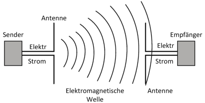 Bei einer Funkübertragung werden elektromagnetische Wellen in einem bestimmten Frequenzbereich zwischen einem Sender und einem Empfänger übertragen. Die Senderantenne erzeugt durch eine Wechselspannung einen Wechselstrom in der Antennenleitung, was ein sich veränderndes elektrisches Feld erzeugt. Dieses elektrische Feld erzeugt wiederum ein sich veränderndes magnetisches Feld. In diesem magnetischen Feld bilden sich elektromagnetische Wellen, die bei der Empfangsantenne eine induzierte Wechselspannung erzeugen und so einen Wechselstrom im Empfänger erzeugen.